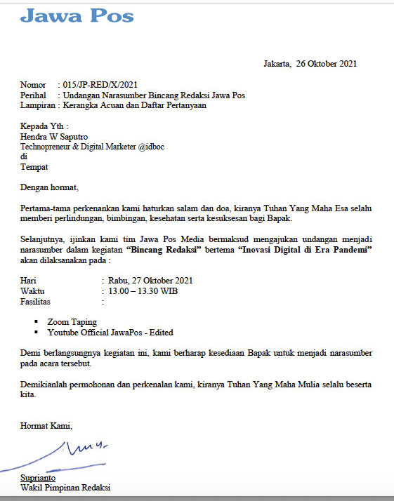 JawaPos.Com mengundang dua narasumber untuk talkshow Bincang Redaksi bertema Inovasi Digital di Era Pandemi pada Rabu, 27 Oktober 2021 pukul 13.00 – 13.30 WIB melalui zoom meeting.