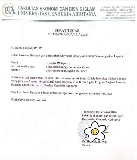 CEO BOC Indonesia, Hendra W Saputro mendapatkan mandat tugas dari Dekan Fakultas Ekonomi dan Bisnis Islam (FEBI), Universitas Cendekia Abditama di Tangerang – Provinsi Banten untuk menjadi dosen praktisi.
