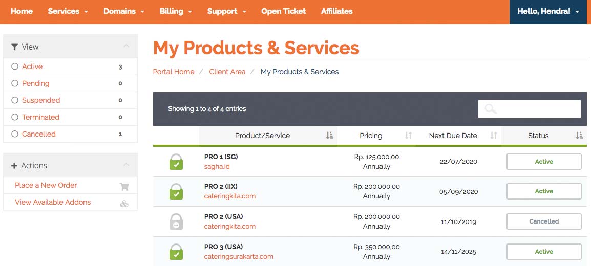 Informasi produk web hosting, SSL dan VPS yang telah dibeli pelanggan berada di halaman Services. Berikut tampilannya.