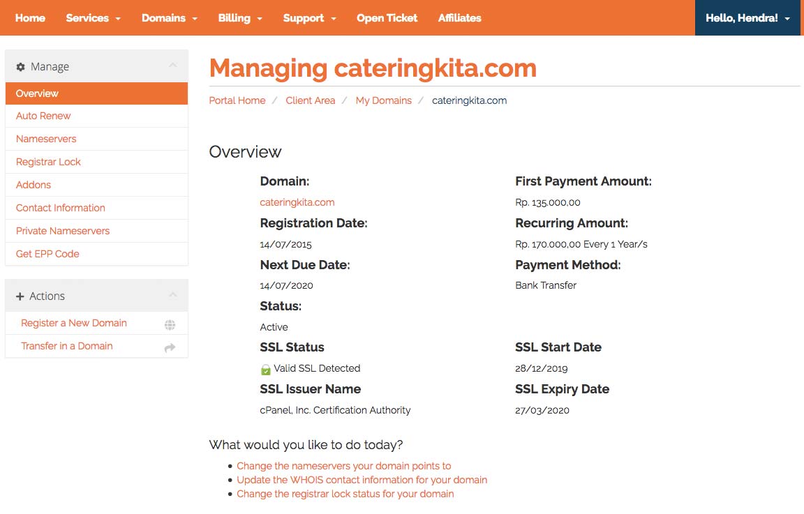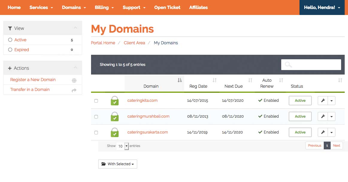 Adalah halaman yang menyimpan informasi domain name yang telah terbeli oleh pelanggan dengan beragam status yaitu yang masih aktif ataupun expired. Seperti terlihat dibawah ini: