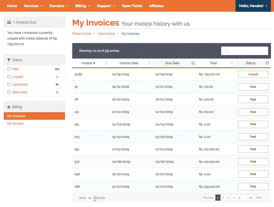 Kumpulan transaksi bisa ditemukan pada menu Invoices di halaman depan atau klik Billing di menu atas. Segala transaksi atas order produk BOC disimpan di halaman ini. Baik itu yang sudah terbayarkan (paid), pending (unpaid), ataupun cancelled. Seperti terlihat di gambar bawah: