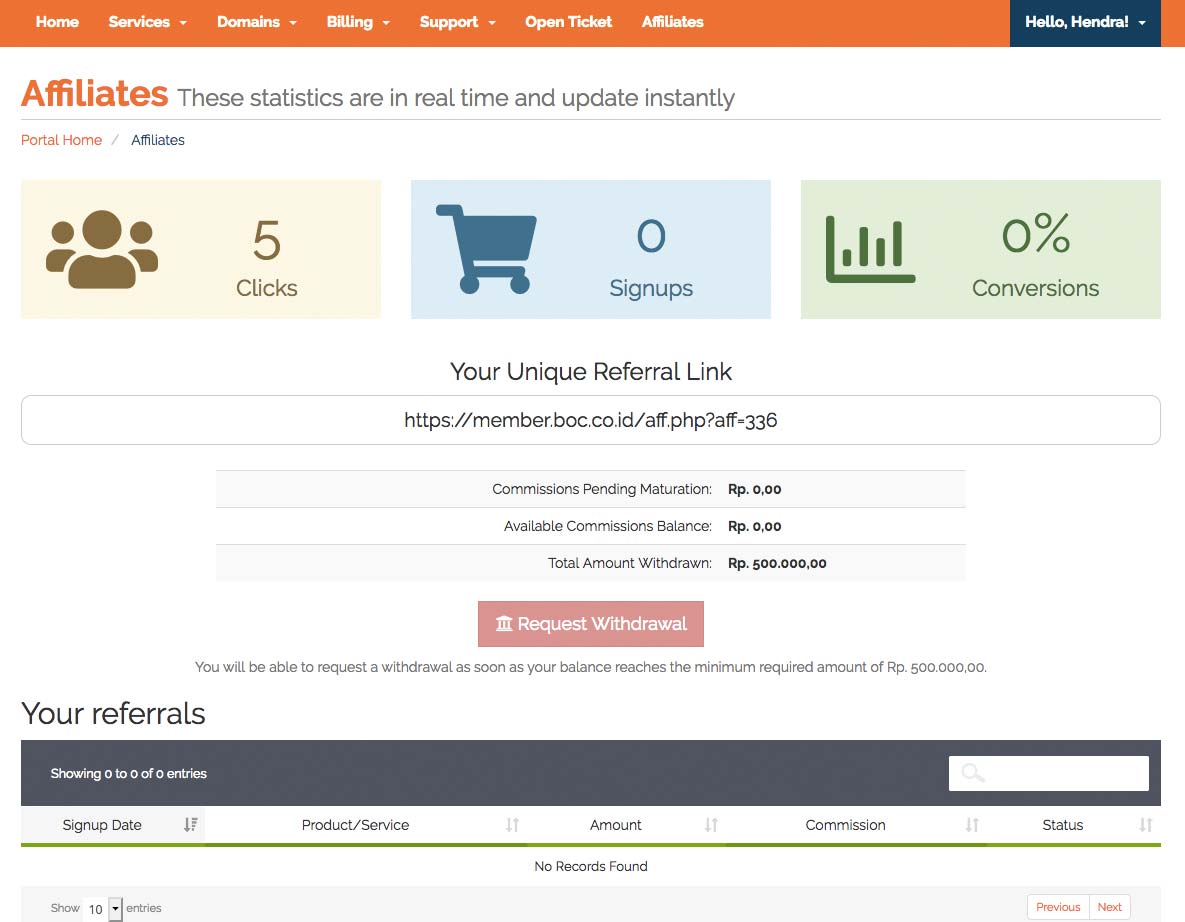 Adalah halaman yang berisi informasi afiliasi hosting. Pelanggan bisa mengikuti program afiliasi dengan mereferensikan produk BOC kepada masyarakat. Akan mendapatkan komisi menarik dari BOC. Informasi setting dan hasil afiliasi akan tersimpan di halaman Affiliates. Seperti dalam gambar dibawah: