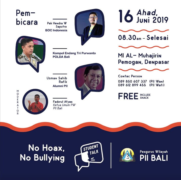 Bersama team dari POLDA Bali, Bapak Kompol Endang Tri Purwanto dan CEO BOC Indonesia, Hendra W Saputro, membersamai seminar Anti Hoax dan Anti Bullying yang diselenggarakan oleh Pengurus Wilayah Bali Pelajar Islam Indonesia (PII).